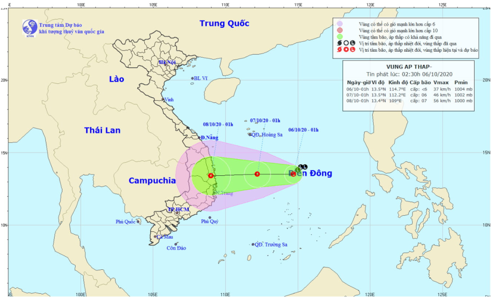 Hồi 01 giờ ngày 06/10, vị trí trung tâm vùng áp thấp ở vào khoảng 13,0-14,0 độ Vĩ Bắc; 114,2-115,2 độ Kinh Đông, cách đảo Song Tử Tây khoảng 300km về phía Bắc.