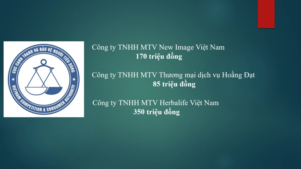 Công ty TNHH MTV Herbalife Việt Nam xử phạt vi phạm hành chính số tiền 350 triệu đồng do vận hành hệ thống công nghệ thông tin quản lý mạng lưới người tham gia bán hàng đa cấp không đúng với giải trình kỹ thuật khi đăng ký hoạt động bán hàng đa cấp.